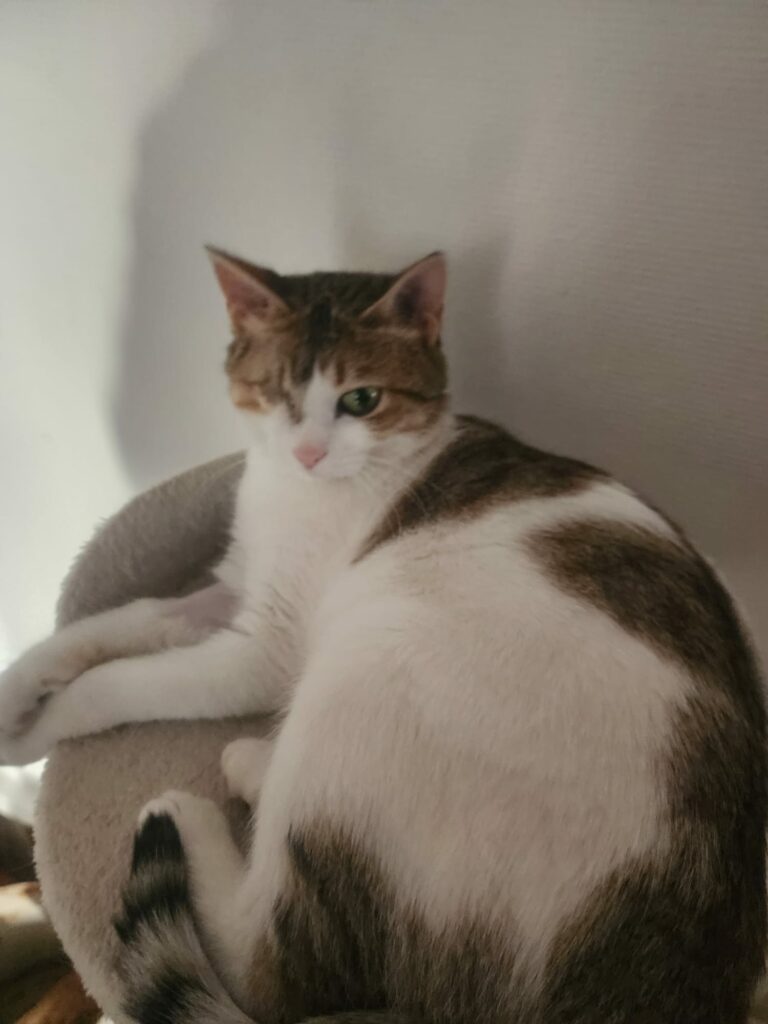 C’est une adorable chatte junior câline, tendre et proche de l’humain, agréable à vivre, une compagne sensible et douce. Son début de vie n’a pas été facile et elle en garde quelques séquelles : faute de bons soins avant notre prise en charge, son œil droit a dû être énucléé, mais cela n’affecte pas sa vie quotidienne.